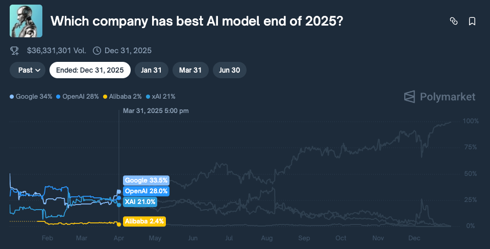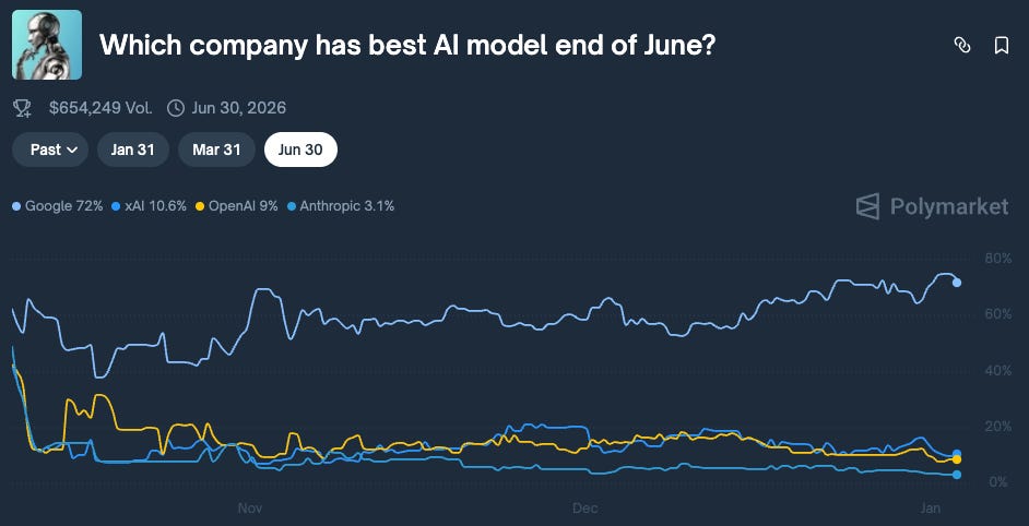 As for what the market thinks about the future. The furthest Polymarket looks is June 2026, and the market thinks that Google is running away with it.